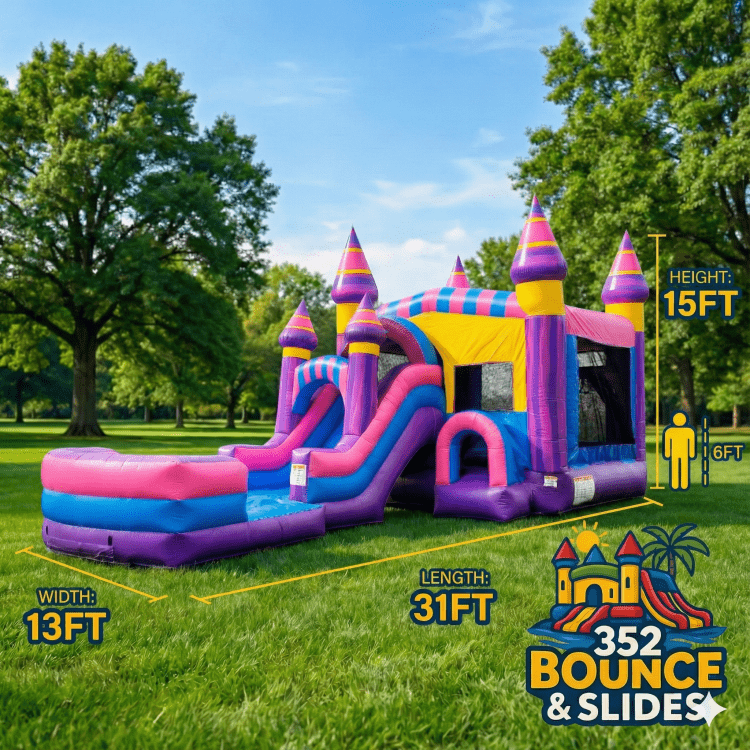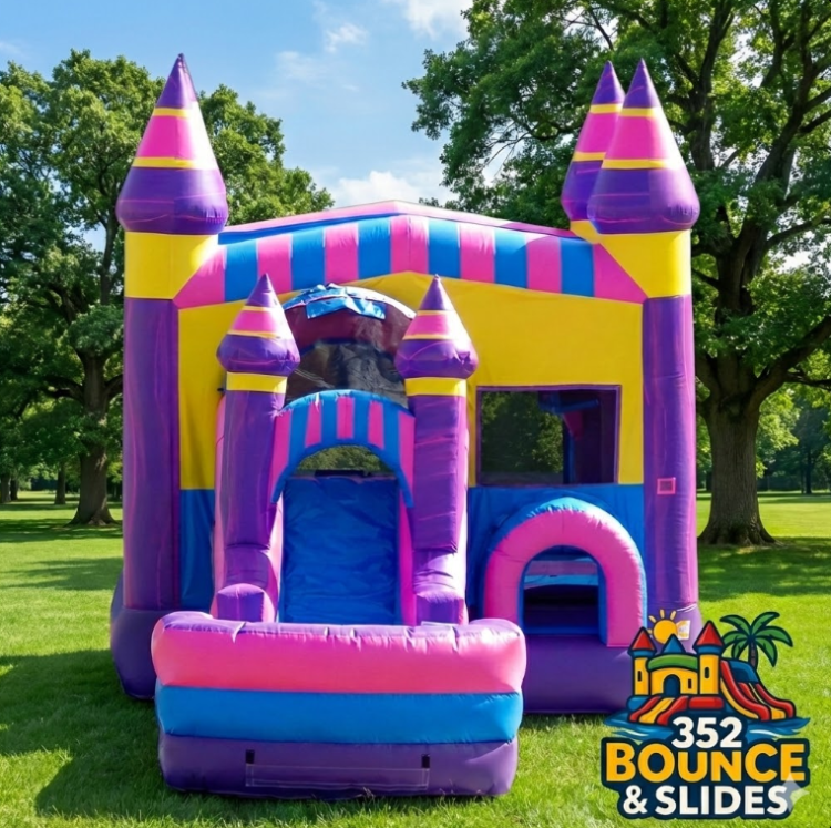 is a colorful and versatile inflatable that combines a bounce house and slide in one fun unit. Its bright cotton candy colors make it a popular choice for birthdays, backyard parties, and family events.