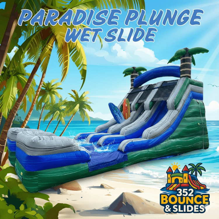 Bring the beach to your backyard with the 16ft Paradise Plunge, a tropical-themed dual-lane slide that delivers nonstop fun whether you use it wet or dry. With two racing lanes, kids and adults can challenge each other to see who reaches the bottom first, making it one of the most exciting units in our lineup.